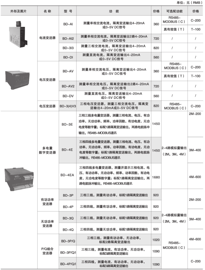 BD-4EA 三相四線多電量變送器,測量并顯示三相電流、電壓、有功功率、無功功率、頻率、功率因數、有功電度、無功電度等數字量;1-4路模擬量可選,兩路電能脈沖輸出,RS485-MODBUS通訊