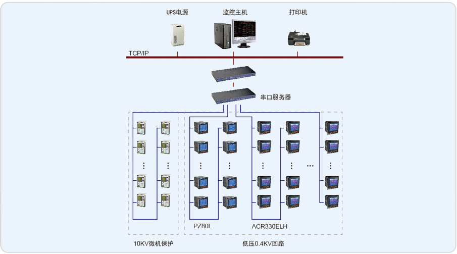 10kV回路的進線和饋線配有微機保護裝置;0.4kV進線和母聯回路裝有ACR330ELH電網質量分析儀,采集回路的常規電參量、四象限電度和電網質量參數;0.4kV饋線回路裝有PZ80L系列多功能電力儀表,采集回路的常規電參量和四象限電度。本系統儀表集中,所以均通過屏蔽雙絞線手拉手相連數據上傳至監控主機。