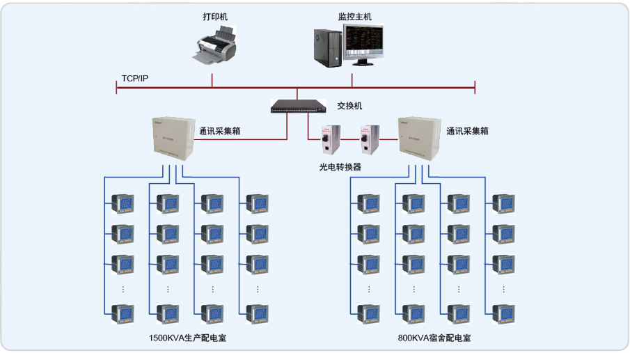 山東電力管道工程公司有兩個配電室:容量1500KVA的生產配電室和800KVA的宿舍配電室,兩個配電室距離約1500米,為實現配電系統的規范化管 理,對舊的配電系統進行改造,兩配電室內的老式指針式儀表更換為上海安科瑞公司的網絡電力儀表,配套Acrel-2000電力監控軟件對現場進行監控,監控室位于生產配電室內。為滿足兩個配電室統一監控的要求,容量1500KVA的生產配電室和800KVA的宿舍配電室通過一根單模四芯的光纖相連,經光電轉換后接入網絡交換機,進而實現對現場數據的采集,存儲,處理,實時顯示以及歷史查詢。