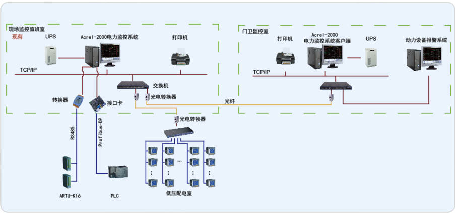 飛浦電子技術(shù)(上海)有限公司動(dòng)力房設(shè)備報(bào)警系統(tǒng),是在現(xiàn)有報(bào)警系統(tǒng)的基礎(chǔ)上進(jìn)行的智能化改造項(xiàng)目。原有系統(tǒng)基于西門(mén)子PLC采集現(xiàn)場(chǎng)各種傳感器變位或報(bào)警信號(hào),再通過(guò)聲、光形式輸出報(bào)警信號(hào)。為了便于管理和維護(hù),將動(dòng)力房設(shè)備報(bào)警系統(tǒng)PLC數(shù)據(jù)以及部分未接入PLC的報(bào)警開(kāi)關(guān)量通過(guò)安科瑞ARTU裝置采集至現(xiàn)有的安科瑞Acrel-2000電力監(jiān)控系統(tǒng);在門(mén)衛(wèi)監(jiān)控室增加兩臺(tái)監(jiān)控計(jì)算機(jī),一臺(tái)作為安科瑞Acrel-2000電力監(jiān)控系統(tǒng)客戶(hù)端,另一臺(tái)整合了動(dòng)力房設(shè)備報(bào)警系統(tǒng)遠(yuǎn)程訪(fǎng)問(wèn)客戶(hù)端;原監(jiān)控值班室和門(mén)衛(wèi)值班室之間通過(guò)光纖組建局域網(wǎng),實(shí)現(xiàn)系統(tǒng)遠(yuǎn)程監(jiān)控。
