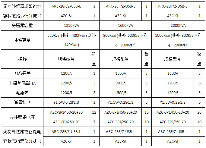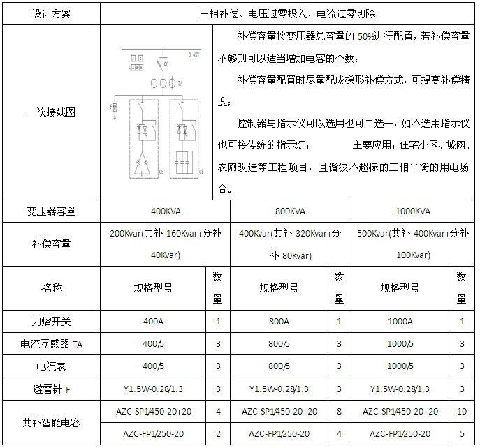 1、變壓器容量為400/800/1000/1250/1600/2000KVA的三相補償應用方案。